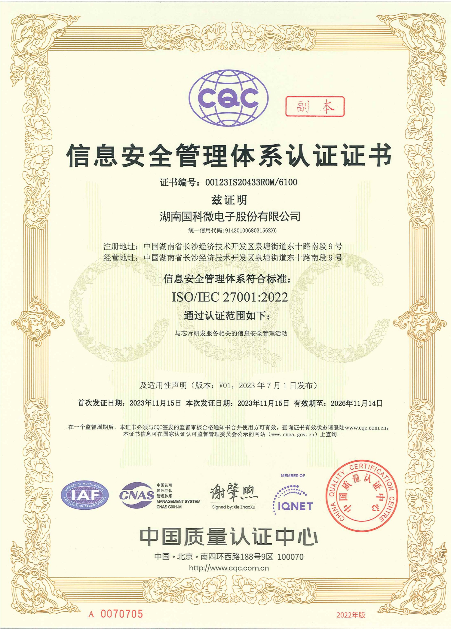 信息安全管理體系認證證書